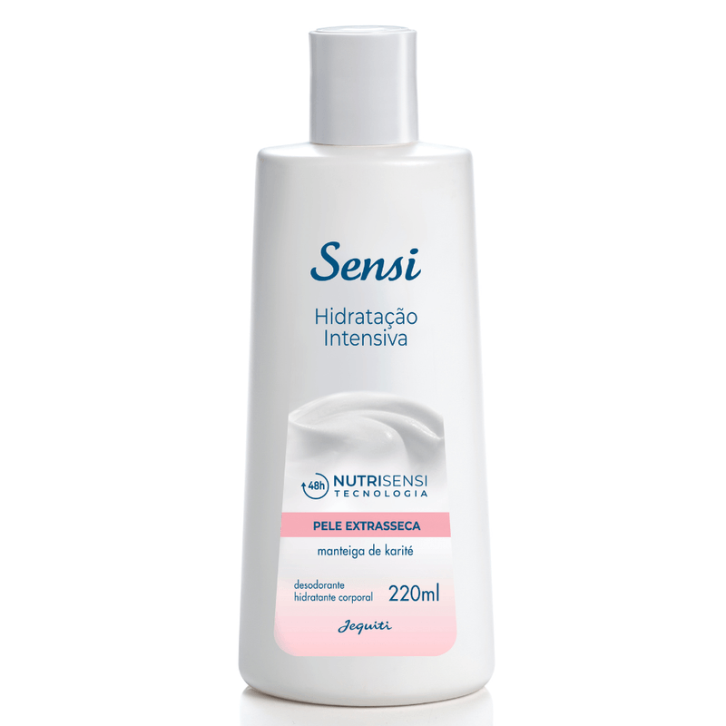 O Desodorante Hidratante Corporal Sensi Hidratação Intensiva 220ml, da Jequiti, é formulado com a tecnologia NutriSensi, enriquecida com manteiga de karité e glicerina, ideal para peles extrassecas. Oferece hidratação por 48 horas, deixando a pele nutrida, macia e sedosa. Dermatologicamente testado.